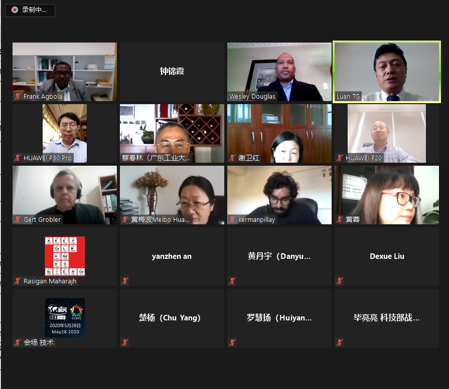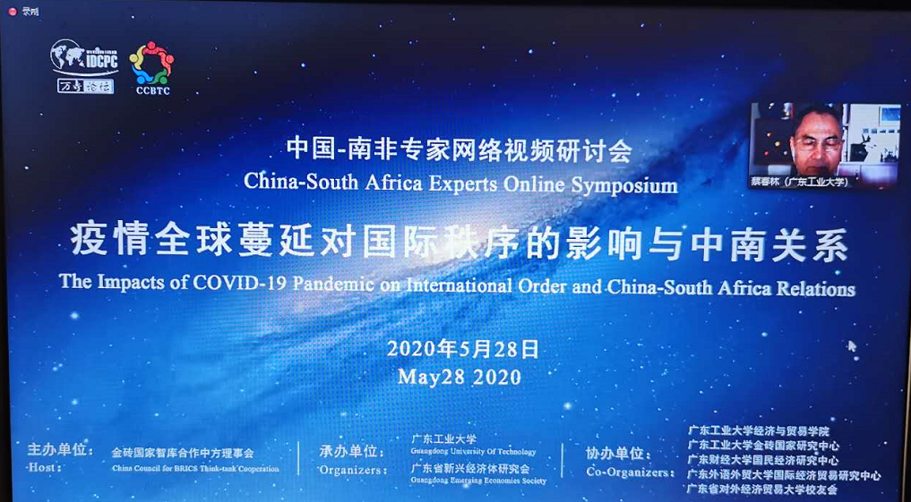 受中共中央对外联络部的委托,新兴经济体研究会与广东工业大学5月28日下午联合承办以“疫情全球蔓延对国际秩序的影响与中南关系”为主题的中国-南非专家网络视频研讨会。本次全英视频云端会议主办单位为金砖国家智库合作中方理事会,承办单位为广东工业大学、广东省新兴经济体研究会。广东工业大学金砖国家研究中心,广东工业大学经济与贸易学院,广东财经大学国民经济研究中心,广东外语外贸大学国际经济贸易研究中心,广东省对外经济贸易大学校友会参加具体协办。中共中央对外联络部研究室主任、金砖国家智库合作中方理事会秘书长栾建章出席会议,广东工业大学党委常委、副校长栾天罡出席会议并致辞,来自南非国际关系委员会、南非黑人商会、中非合作协会、非中人民友好协会、茨瓦内理工大学创新经济研究所、罗德斯大学、夸祖鲁纳塔尔大学以及澳大利亚纽斯卡尔大学等国外机构,中共中央对外联络部研究室、中国社会科学院世界经济与政治研究所、中国科学技术发展战略研究院、北京大学、上海大学、浙江师范大学非洲研究院、广东外语外贸大学国际经贸研究中心、广东外语外贸大学非洲研究院、上海对外经贸大学国际发展合作研究院、暨南大学、广东工业大学等单位的相关领导、专家、学者共计51人出席研讨会。线上研讨会由新兴经济体研究会会长蔡春林主持,与会专家就“疫情下中南战略伙伴关系”、“中南携手参与全球卫生治理”、“新冠疫情背景下中非合作新途径”等三个议题进行了充分的研讨,普遍认为,疫情后世界经济的恢复建设离不开新兴国家的共同努力,包括中国与南非之间的合作。疫情的冲击对两国经济社会的发展带来了严峻的挑战,但也为两国的合作,尤其是高科技抗疫与公共卫生领域的合作,带来了新的机遇。