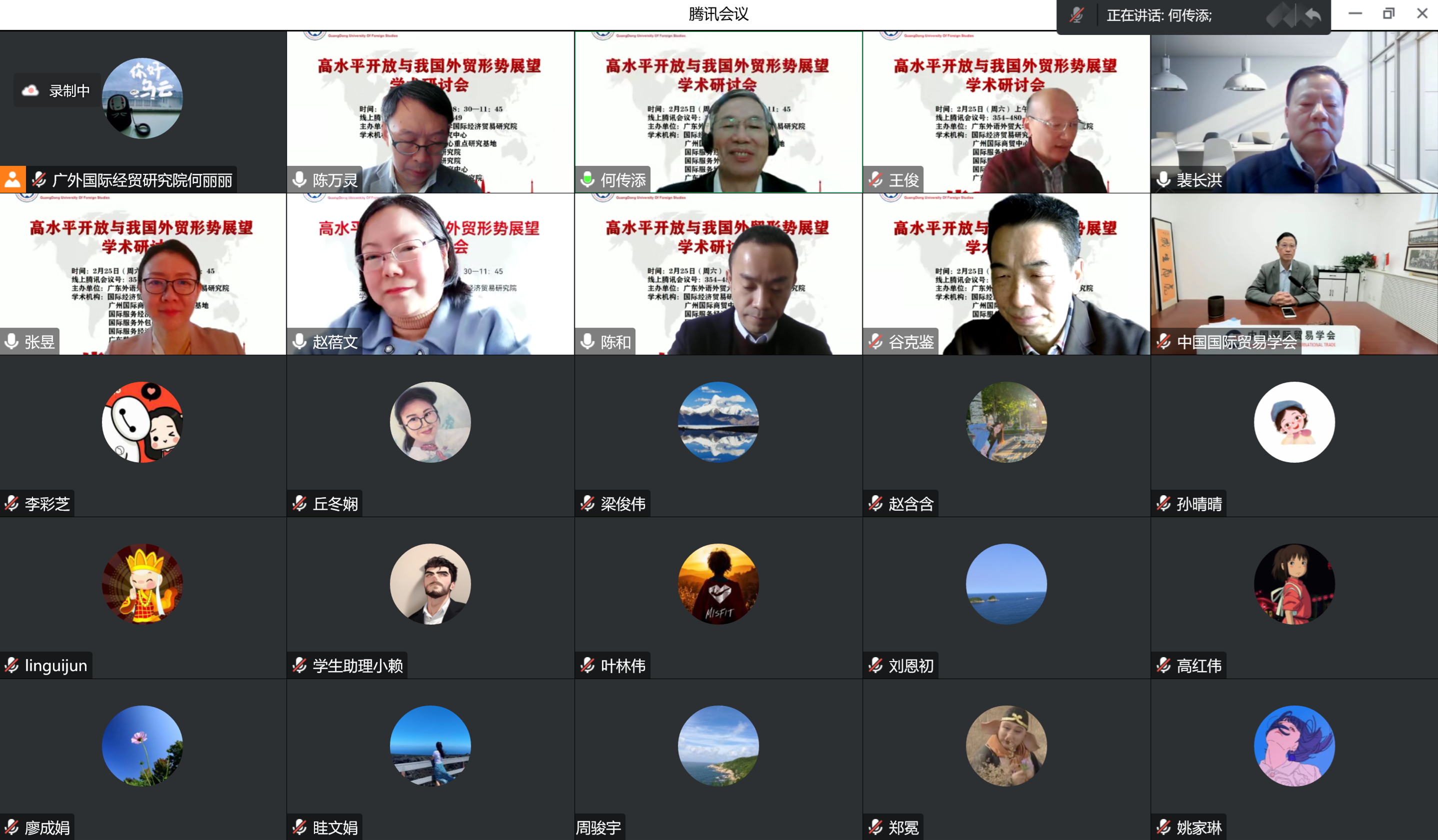 2023年2月25日上午,高水平开放与我国外贸形势展望学术研讨会成功以视频会议形式召开。本次研讨会由我校国际经济贸易研究院主办,国际经济贸易研究中心、广州国际商贸中心重点研究基地、国际服务经济研究院、国际服务外包研究院、国际服务经济研究中心、广东数字经济与贸易研究院共同承办。校党委常委、副校长何传添教授出席会议并致辞,中国社科院经济研究所裴长洪研究员、中国国际贸易学会副会长李钢研究员、中国人民大学商学院谷克鉴教授、上海社科院世界经济所副所长 (主持工作) 赵蓓文教授、对外经济贸易大学国际经济研究院院长桑百川教授、我校云山工作室首席专家林桂军教授、我校经贸学院梁俊伟副教授以及我研究院陈万灵教授、张昱教授、陈和教授和校内外专家学者、研究生等共计近百人相聚云端,国际经济贸易研究院院长王俊教授主持了会议。