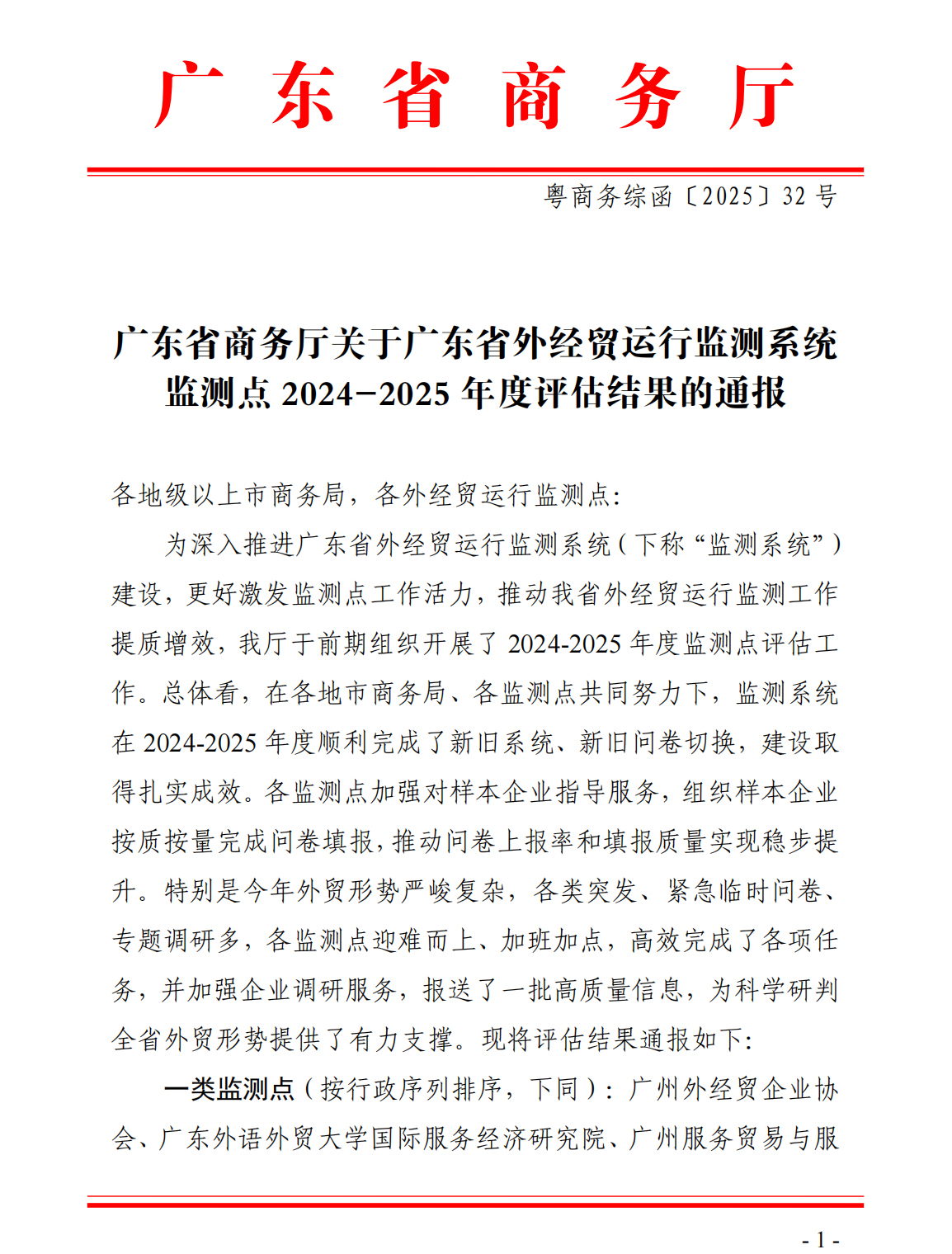 2025年8月,依托我院建设的国际服务经济研究院在2024-2025年度评估中再度被广东省商务厅评为“广东省外经贸运行监测系统一类监测点”。