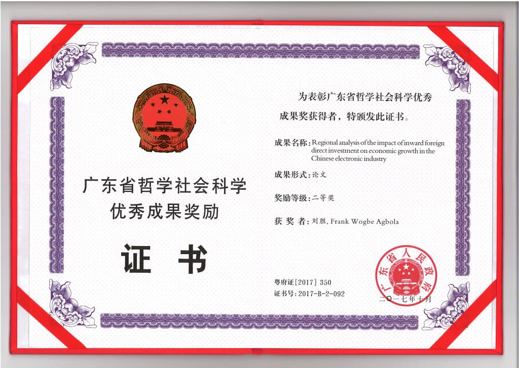 我中心陈万灵教授与合作者的学术著作《中国与东盟经贸合作战略与治理》获得广东省第七届哲学社会科学优秀成果奖二等奖,刘胜副教授与合作者的论文《Regional analysis of the impact of inwardforeign direct investment on economic growth in the Chinese electronic industry》获得广东省第七届哲学社会科学优秀成果奖二等奖。2017年12月5日参加广东省第七届哲学社会科学优秀成果颁奖大会,获受奖励证书。