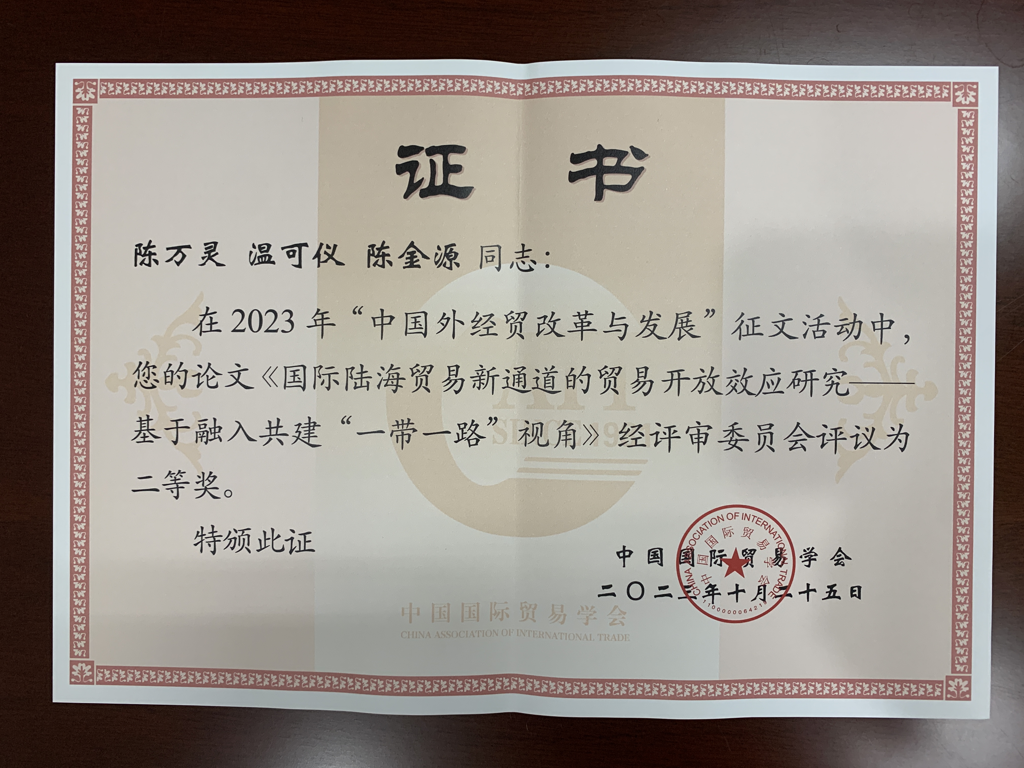 2023年11月24日—25日,由中国国际贸易学会和首都经济贸易大学共同主办的2023年中国国际贸易学会年会暨国际贸易发展论坛在北京隆重举行,我院陈万灵教授、温可仪博士研究生、陈金源博士研究生合作撰写的《国际陆海贸易新通道的贸易开放效应研究——基于融入共建“一带一路”视角》论文荣获学会征文二等奖。