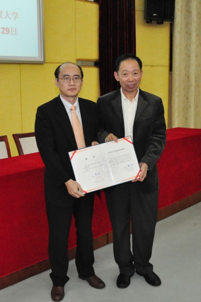2009年11月29日,我中心与经贸学院荣幸地邀请到了中国人民大学书报资料中心总编辑、博士生导师孟捷教授来我校进行学术交流。晚上8点,在南校八角楼为广外师生带来了一场题为“暗默知识与企业理论:一个演化经济学的视角”的学术讲座。此次讲座由人事处主办,国际经贸研究中心、经贸学院、《国际经贸探索》《广东外语外贸大学学报》承办,国际经贸研究中心主任陈万灵主持了讲座。副校长董小麟教授,主编肖红教授,经贸学院院长李铁立教授,副院长何元贵教授、易行健教授等出席了讲座。讲座开始前,董小麟副校长代表学校向孟捷教授颁发了客座教授聘书并赠送纪念品。